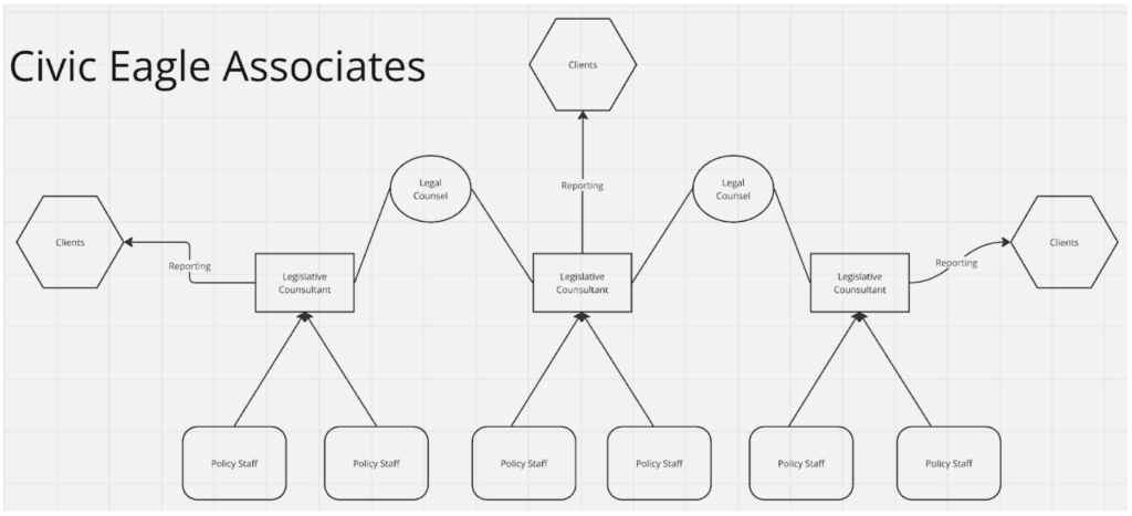 Suppose Civic Eagle Associates (CEA) tracks state legislation across the country for their clients. CEA has a team of policy staff tasked with identifying new legislation that may be of interest to their clients, legislative consultants who create reports for clients, and legal counsel offering analysis to legislative consultants.