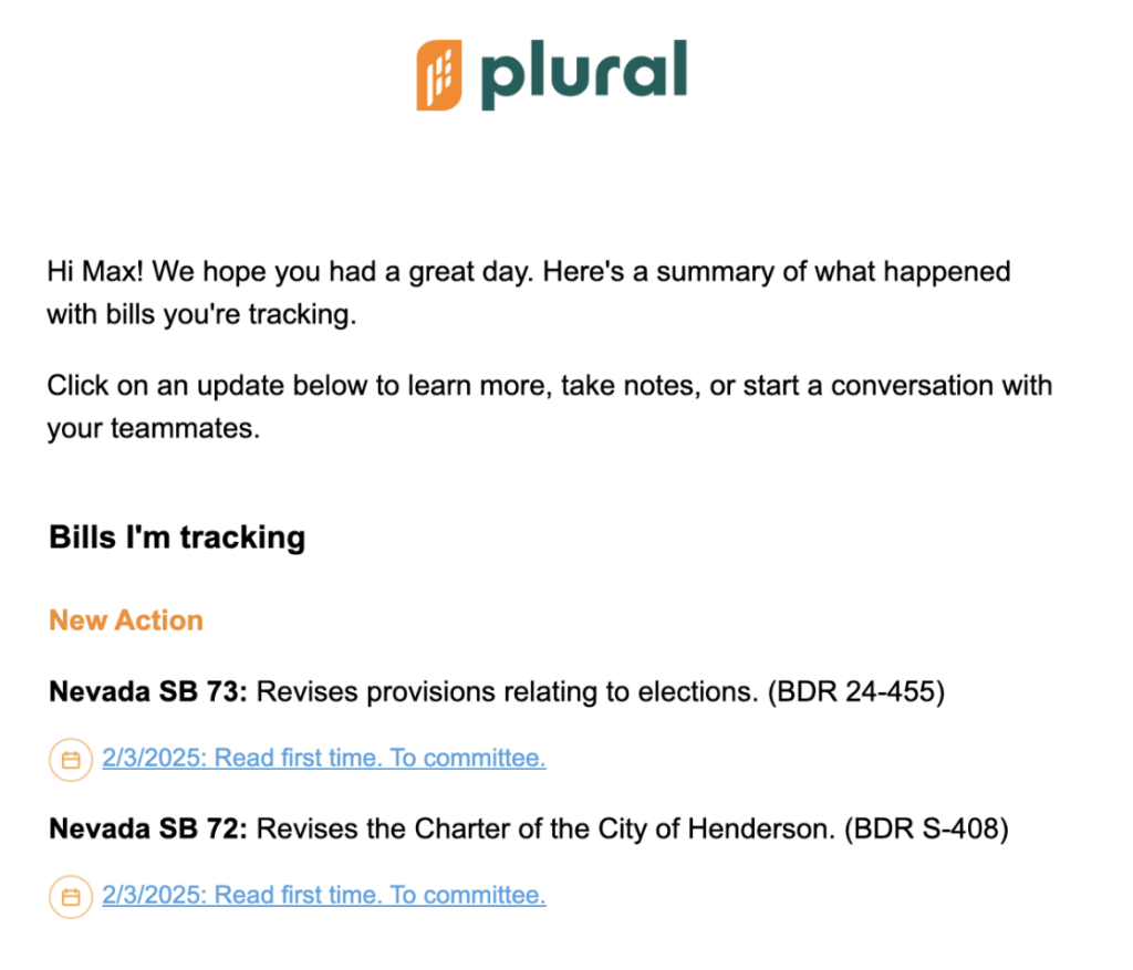 Plural will send you alerts of recent action on bills you are tracking in Plural via Bill Update Notifications. These emails will include each of your tracked bills with new actions, alongside a description of that new action and a link to visit the bill page within your Plural instance. Users leverage bill update notifications to keep their eye on the progress of the bills that matter to them most and to be the first informed about an upcoming public hearing or vote.
