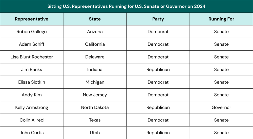 Nine sitting U.S. Representatives are major party nominees for U.S. Senate or Governor in 2024. All but three are heavily favored to win their races. Of these, only Rep. Slotkin of Michigan leaves a district considered a “toss-up” in 2024. Democrats will seek to hold onto her seat in addition to helping her reach the U.S. Senate.