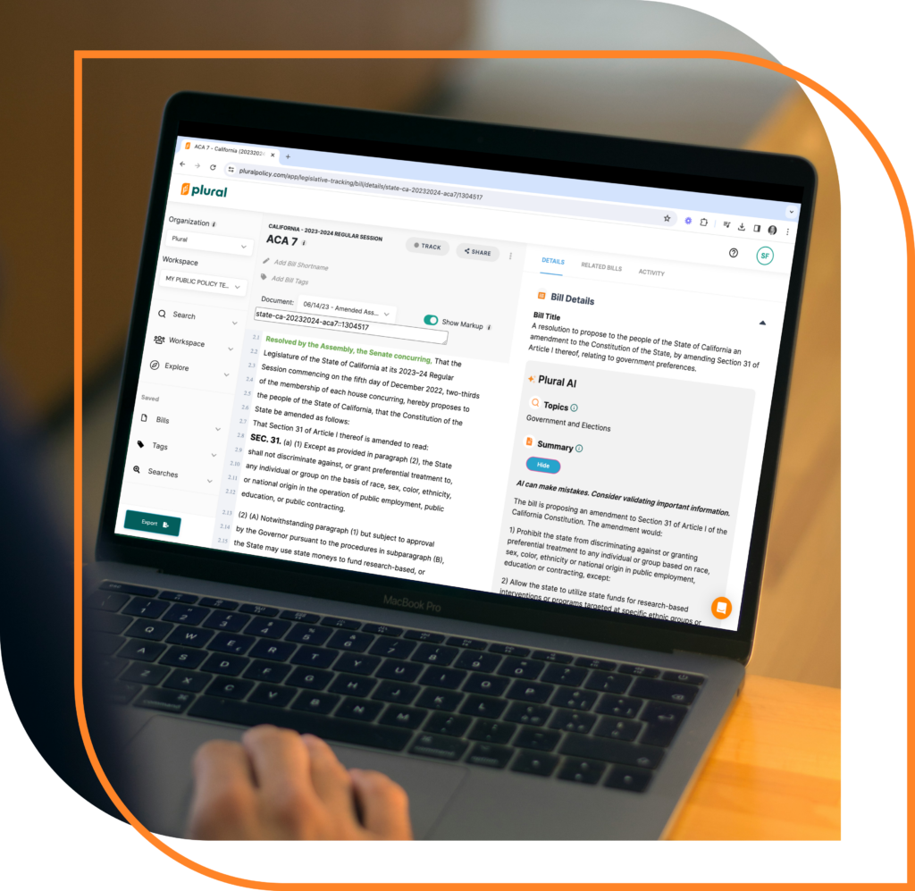 Plural is the policy tracking and legislative intelligence tool of choice for dynamic policy, government relations, and nonprofit teams working in California. Our revolutionary AI Bill Summarizer helps teams save time, get key information, and skyrocket effectiveness. Interested in getting started? Request a demo today!