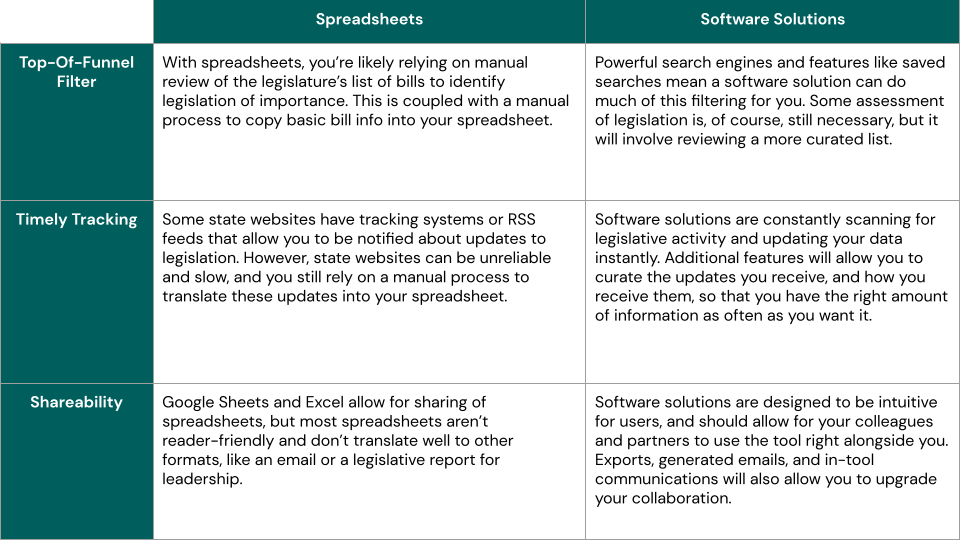 See below for a comparison of spreadsheets vs. a software solution, such as Plural, for your legislative tracking needs.