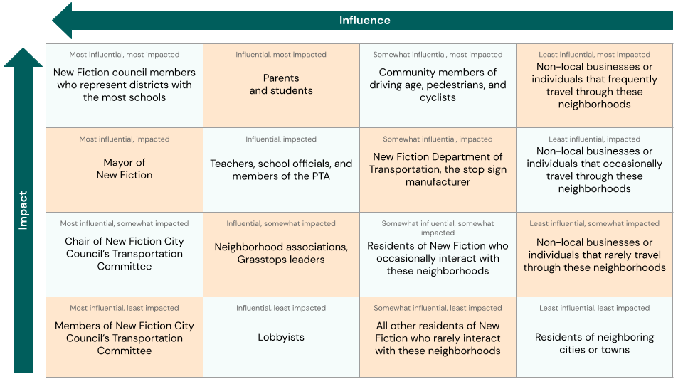 The most influential stakeholder on this issue would likely be anyone who has a direct say or vote in determining the outcome — the chair of the city’s transportation committee, council members on the committee, and the mayor of New Fiction. Next, is who’s likely to be impacted the most — students, schools, their neighborhoods, and council members who represent districts with the most schools.