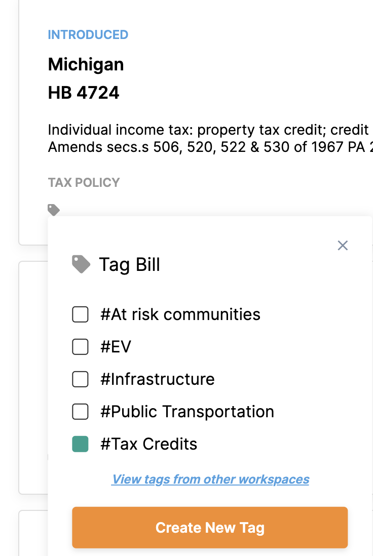 Plural’s tag feature is like a virtual folder system for you to keep your bills of interest organized. Create a “support” and a “oppose” tag, for instance, and apply them to relevant bills, making it simple to find this important category of bills when needed. Additional oft-used tags are “high priority” or “low priority;” or by topic such as “education” “healthcare” and “budget.” There’s no limit to the number of tags you can create in Plural or to the number of tags that can be associated with bills, making it easy for you to find your bills across a variety of useful categories.