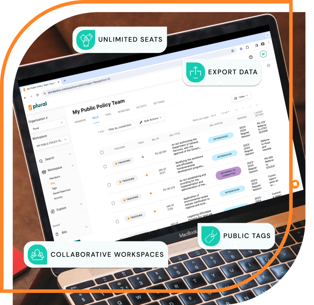 Plural offers unlimited dedicated workspaces for team collaboration, allowing for efficient organization and tracking of legislative initiatives. Within your workspaces, you can annotate bills, create and share notes, and upload external files to keep all your resources in one place.