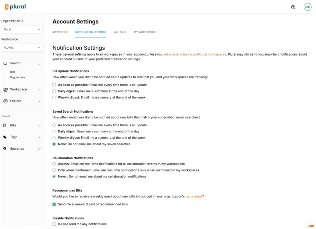 Beyond these basic settings, Plural offers even more customization. Users can enable notifications for specific saved searches or adjust settings within individual workspaces. Many teams take advantage of this flexibility by setting general updates to daily or weekly while keeping real-time alerts for their most critical bills.