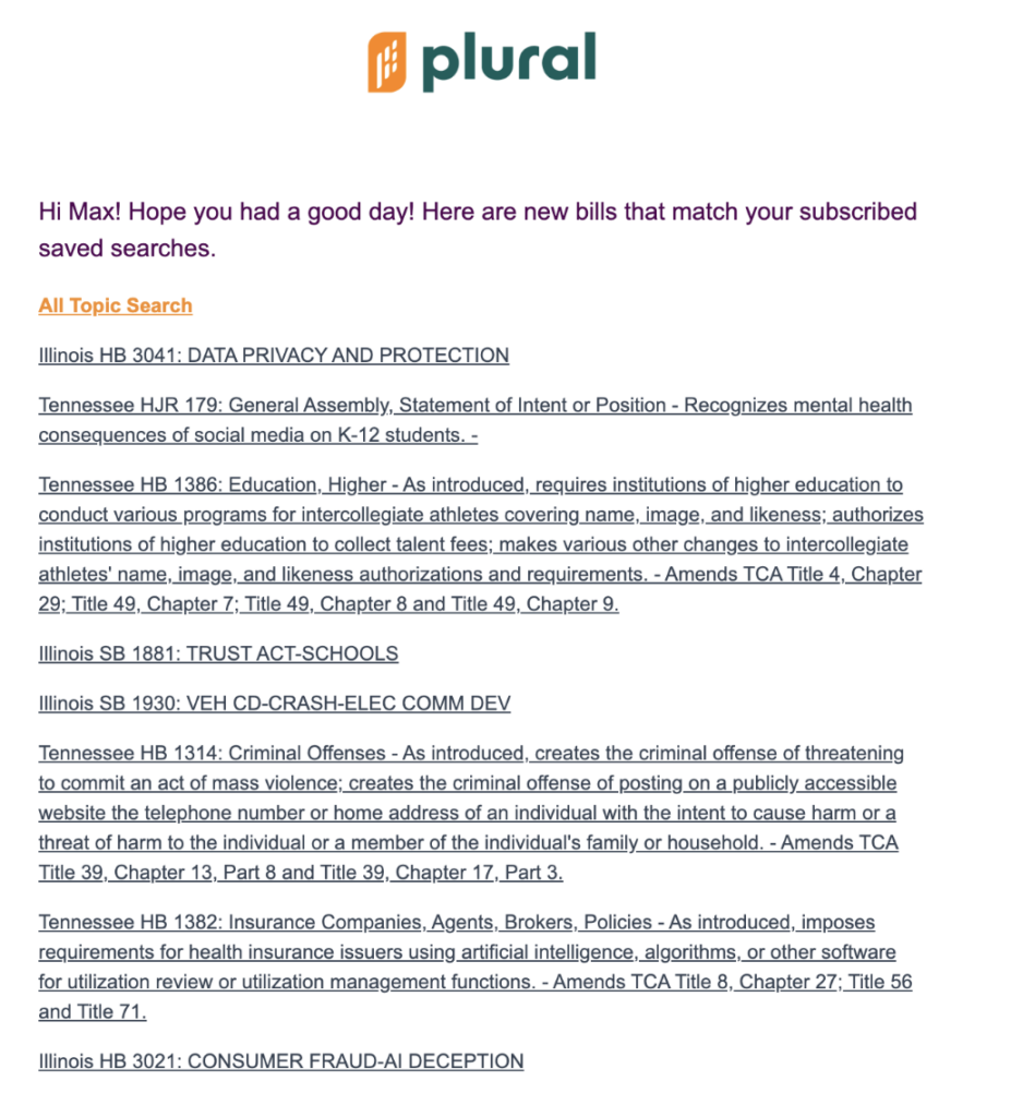 Plural will send you alerts of recent action on bills you are tracking in Plural via Bill Update Notifications. These emails will include each of your tracked bills with new actions, alongside a description of that new action and a link to visit the bill page within your Plural instance. Users leverage bill update notifications to keep their eye on the progress of the bills that matter to them most and to be the first informed about an upcoming public hearing or vote.