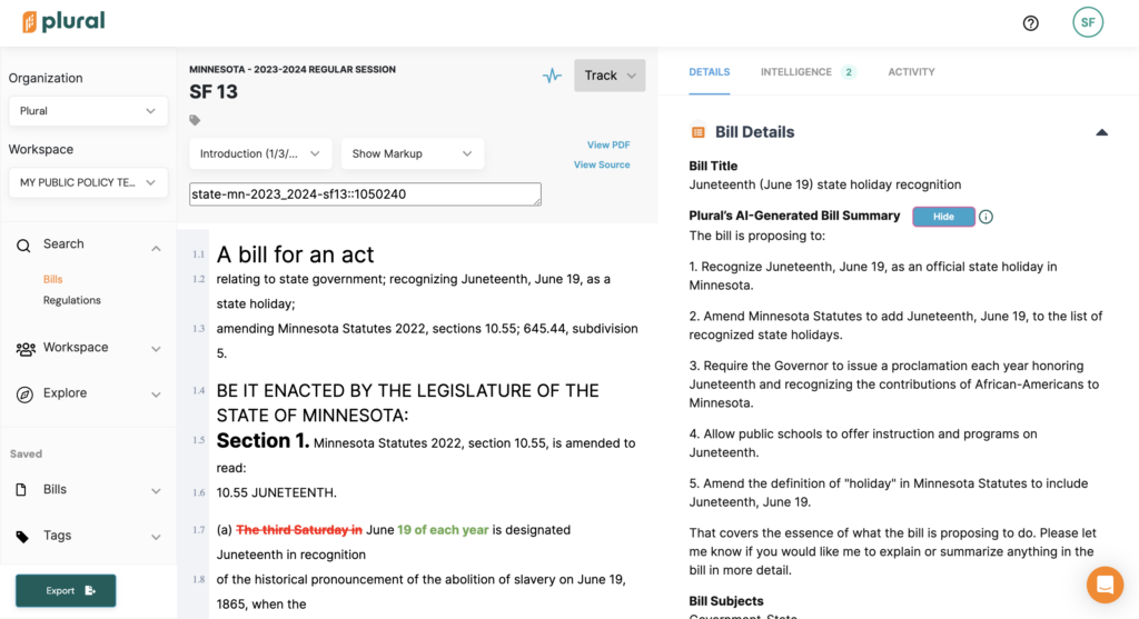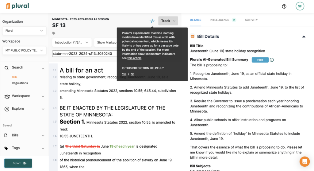 At Plural, we know that policy work doesn’t happen in a vacuum. Unlimited workspaces make it easy to organize your work and collaborate effectively. Plus, annotate bills, share notes, upload files, and mention your teammates in comments. Plural is an all-in-one tool for your team’s policy work and collaboration.