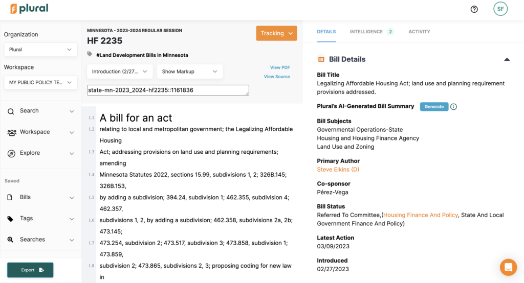 With Plural, it’s easy to use AI to deepen your policy insights. Find similar bills, including companion, reintroduced, and omnibus bills, all in one place. Search across jurisdictions to understand the legislative landscape of a given issue area. Discover which bills are likely to gain momentum and adapt your strategy accordingly. Plus, users can now generate bill summaries using AI! Save time reading dense, detailed bill text and discover the key aspects of a bill, all with a click of a button.
