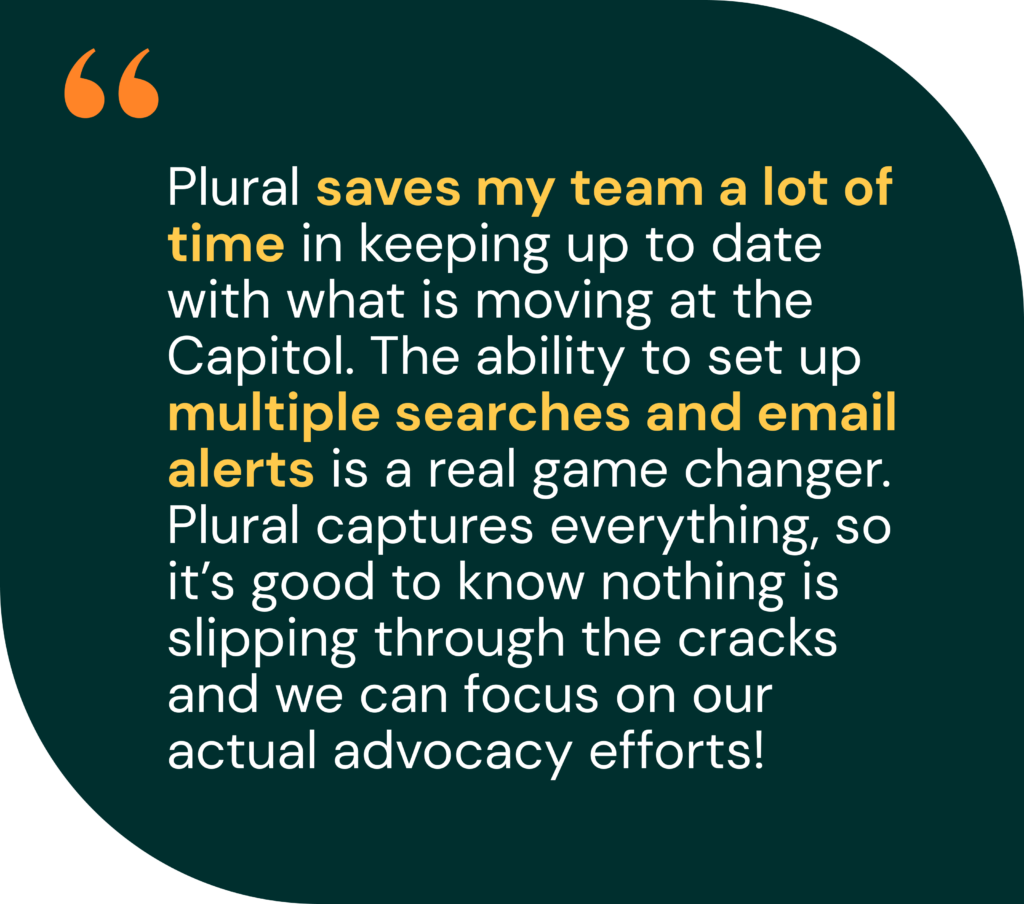Investing in new technology often comes at a significant cost. However, the efficiency gains from using Plural — such as the hours saved in bill tracking and analysis — translate into cost savings in the long run. Plural users save up to 25 hours per week on tasks related to bill searching and analysis. Learn more about Plural’s pricing here.