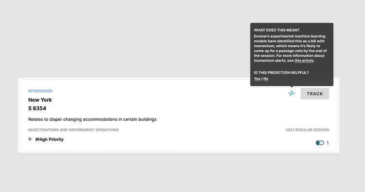 To help you evaluate which bills to track and commit resources to, Plural released a new feature (currently in beta) that marks bills it believes are more likely to be put up for a vote by the end of the session with a pulse icon next to the “Track” button in search. You can also view the pulse icon on its bill card and its bill detail page.