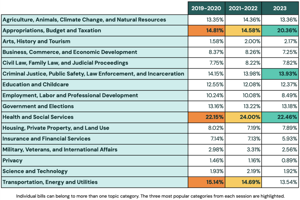 More than 20% of bills introduced in 2023 fell into the Appropriations, Budget and Taxation category. This is likely overweighted, as the first year in a biennium tends to have more appropriations legislation than the second year. Despite this, no other category comes close to the level of consistent focus on Health and Social Services.