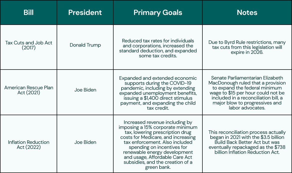 Created by the Congressional Budget Act in 1974, reconciliation is a special parliamentary procedure that allows for certain budget legislation to move through the Senate more quickly and with less support. Debate on reconciliation bills is limited to twenty hours, meaning that the 60-vote majority to end a filibuster that is needed for most legislation is not necessary and the bill can be passed with a simple majority.