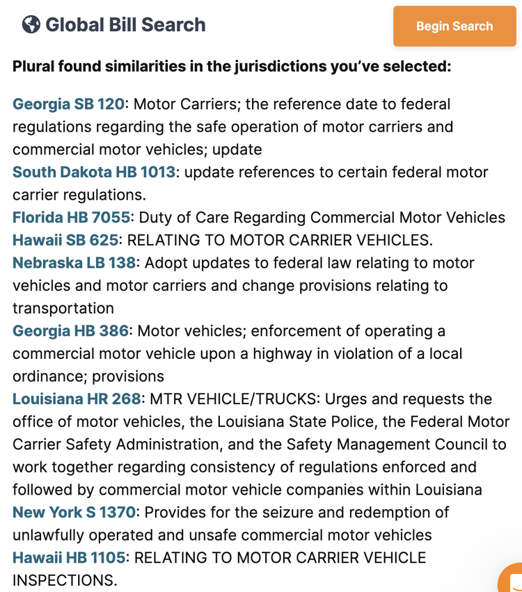 Plural harnesses the power of AI to strengthen the insights you can include in your legislative report. Plural’s Highly Similar Bill feature helps you quickly identify bills that are related or similar to another bill. Or, you can identify patterns in bills across jurisdictions through the use of Plural’s Global Bill Search.