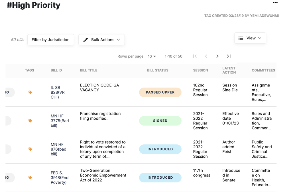 Plural’s tag feature is like a virtual folder system for you to keep your bills of interest organized. Create a “support” and a “oppose” tag, for instance, and apply them to relevant bills, making it simple to find this important category of bills when needed. Additional oft-used tags are “high priority” or “low priority;” or by topic such as “education” “healthcare” and “budget.” There’s no limit to the number of tags you can create in Plural or to the number of tags that can be associated with bills, making it easy for you to find your bills across a variety of useful categories.