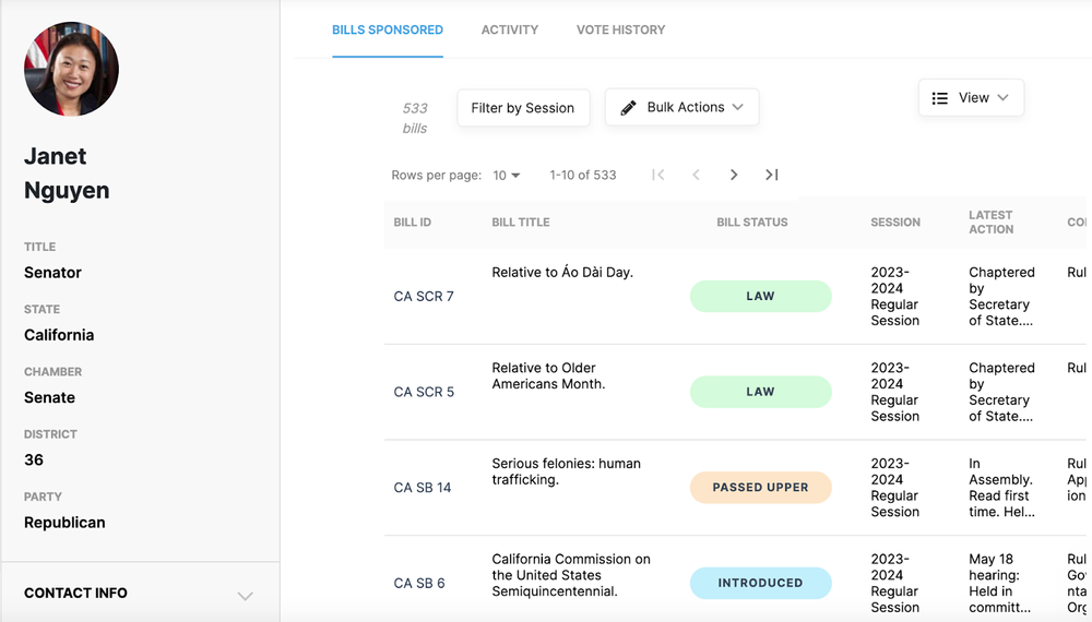 In addition to bill information, you can also find key information for legislators across 52 U.S. jurisdictions, as well as a list of all bills each legislator has authored or co-sponsored, and their legislative voting records