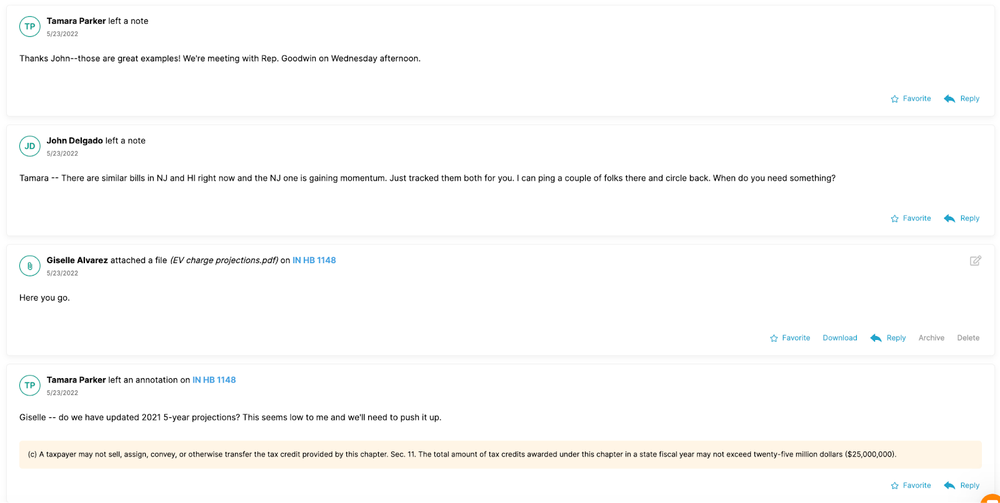Within a workspace, you and your team can create and share notes from staffer meetings on legislator profile pages, annotate bill text, and upload files such as testimony documents, voice memos or media clips that are easily accessible to everyone else in your workspace. No more chasing people at reporting time to get what you need or sifting through dozens of different file formats. It will all be in your workspace – already organized.
