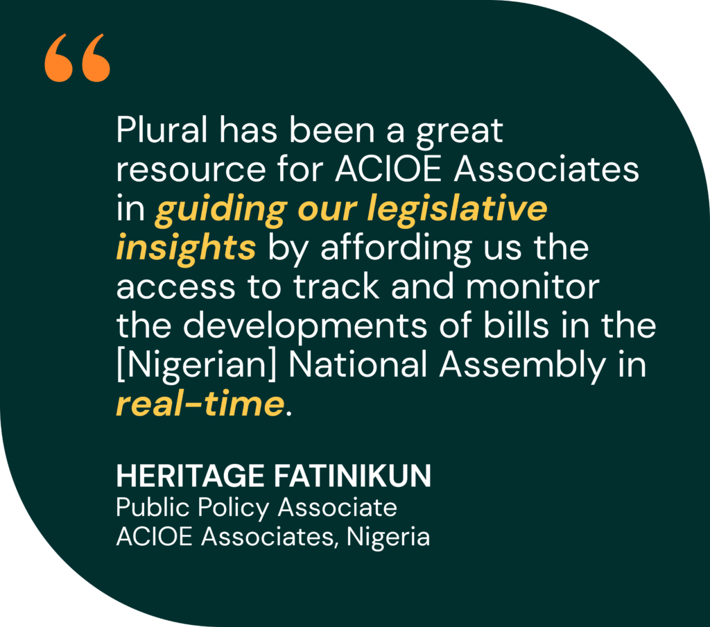 With best-in-class public policy data and real-time notifications, Plural is the tool of choice for top government relations teams in Nigeria. Book a demo today to learn more.