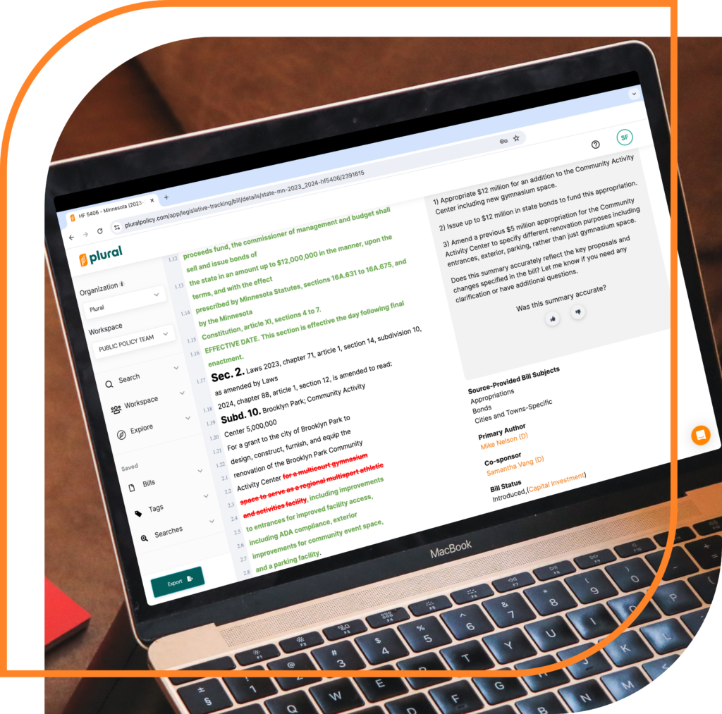 Plural helps professional public policy teams and concerned constituents alike get and stay ahead in the public policy landscape. With Plural, you’ll: