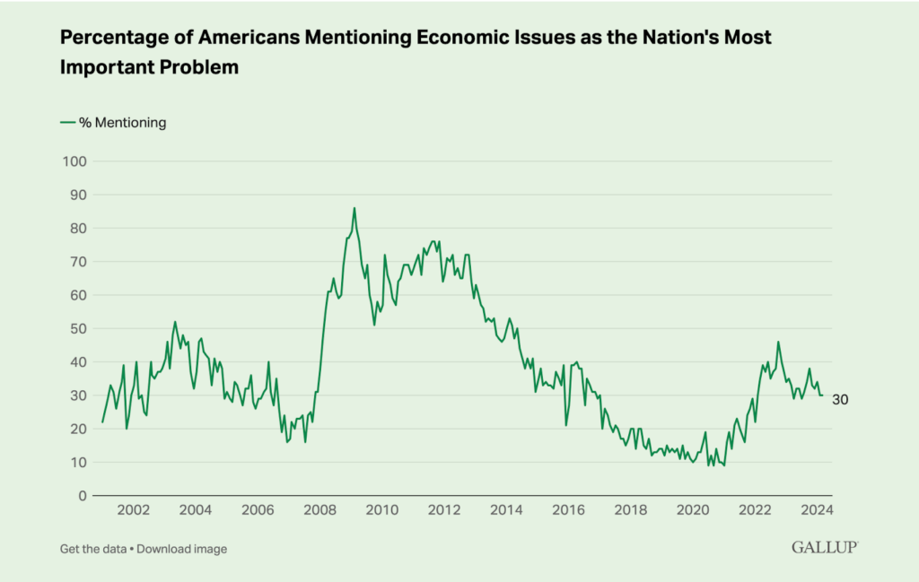 Americans cite economic issues as the most important problem facing the country today. This has been true for the past twenty years. What’s interesting today is that far more respondents indicate a focus on the economy than in 2020.