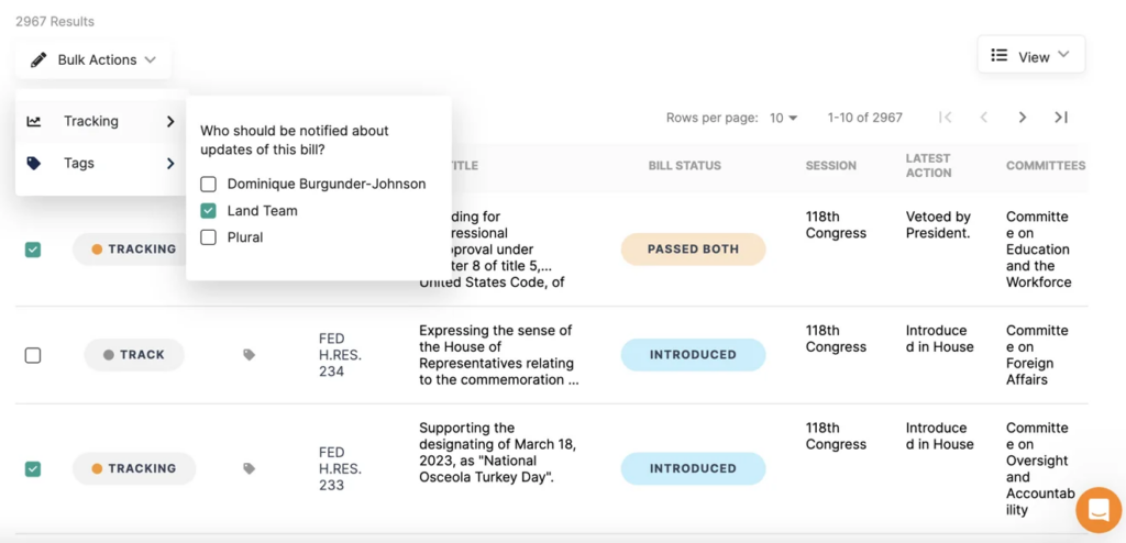 When viewing a list of bill search results in Table View in Plural, you can select multiple bills to track at once.