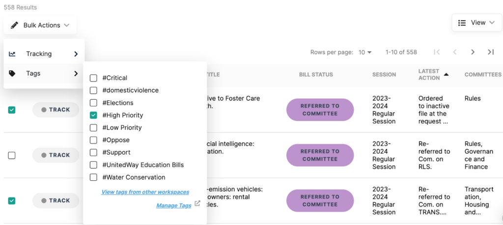 BONUS: To keep a record of your tracked bills from past sessions, create a new tag with the session year and bulk-tag all of the bills before untracking them. This will create a new tag on the left sidebar with all of the bills you worked on in previous session(s), making it easy to access and reference them later.