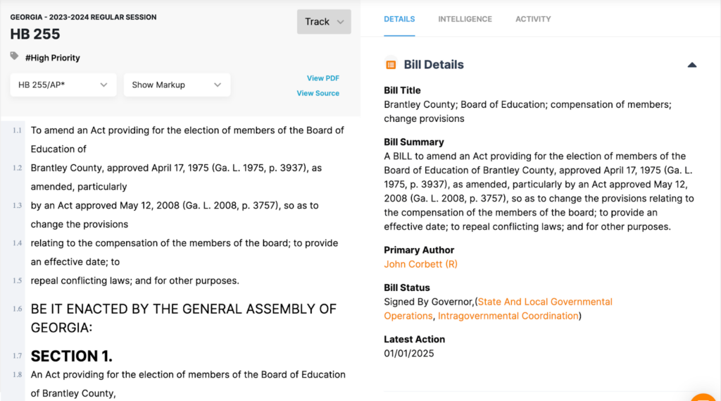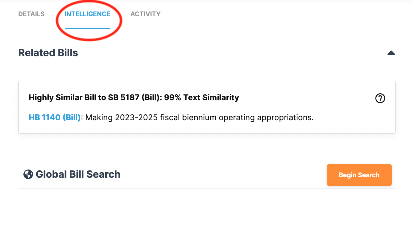 Within the “INTELLIGENCE” tab on a bill page, you’ll see any bills that share text with the bill you’re currently viewing. This is a quick and easy way to find companion bills or an ominous package.
