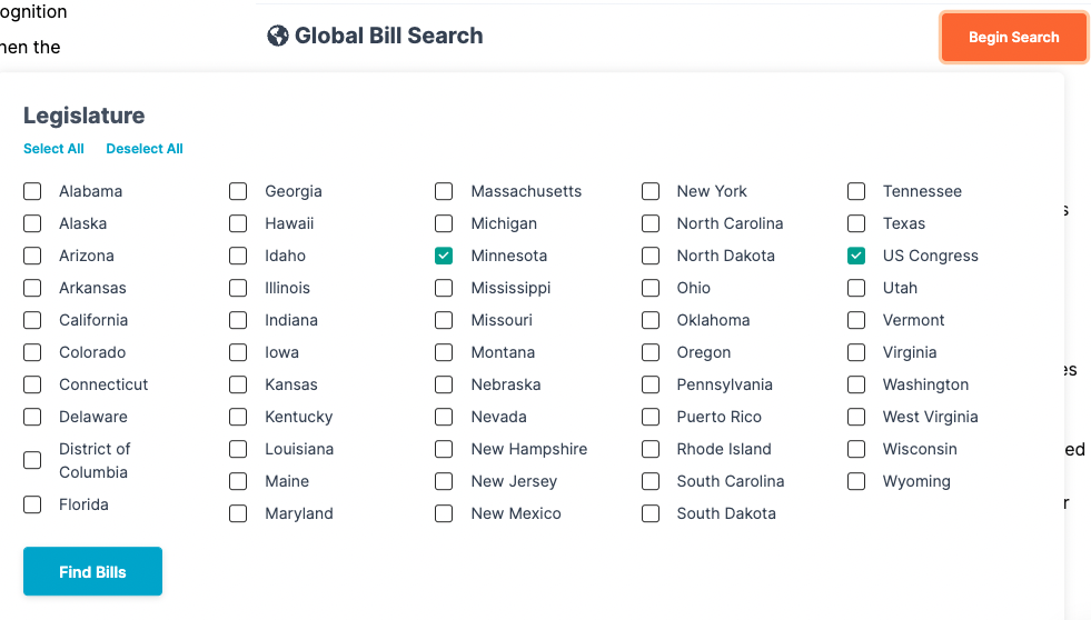 Within the “INTELLIGENCE” tab, you’ll find the Global Bill Search tool. In the Global Bill Search tool, you can select the legislatures in which you’d like to search for bills similar to the one you’re currently viewing.