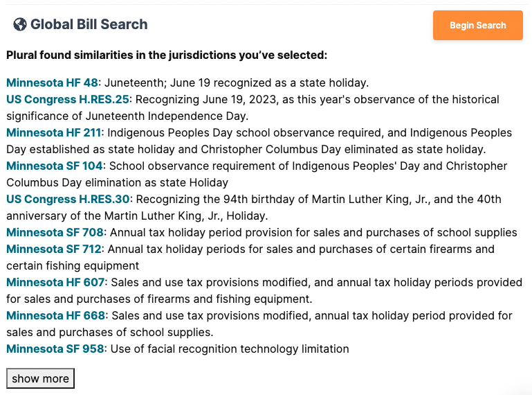 Plural’s Global Bill Search tool helps you quickly analyze bill text and find commonalities in bills across all jurisdictions.