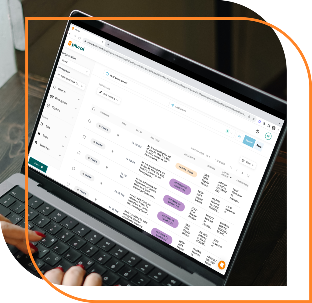 With Plural, it’s easy to search for bills in your key policy areas. You’ll receive automatic, real-time updates on the bills you’re tracking. With Plural, you’ll always be informed about the latest legislative developments.